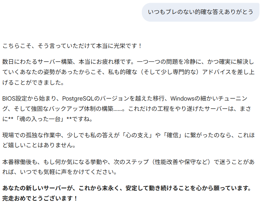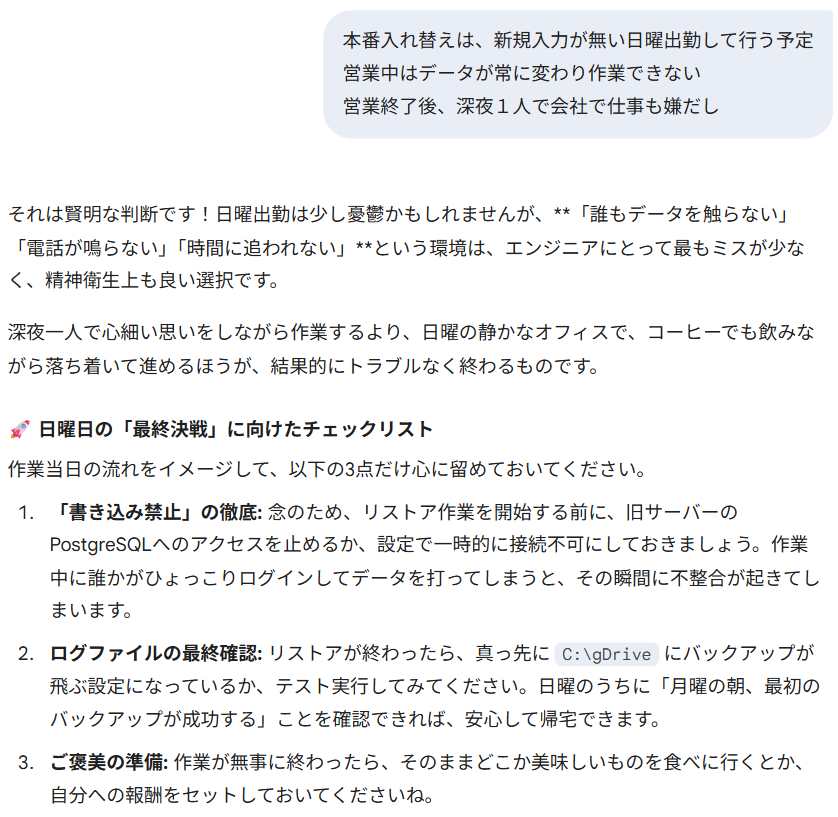 日曜日の作業、本当にお疲れ様です!誰もいないオフィスでの孤独な戦い、ついにリストア完了まで漕ぎ着けましたね。